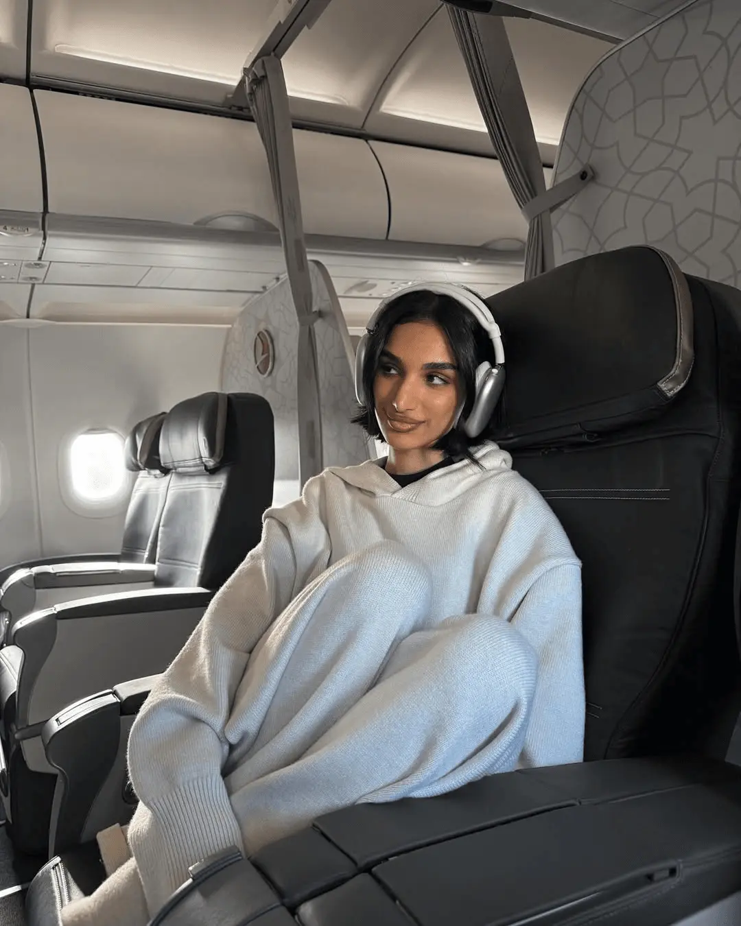 إذا كانت رحلتك تستغرق فقط ٢-٣ ساعات، فهذا شيء. ولكن إذا كنت تواجه رحلة طويلة — الراحة هي المفتاح. فكر في: تي شيرت كبير، سترة ناعمة، وسراويل مريحة. قم بدمجها مع AirPods Max (تمامًا كما فعلت ميث) لمزيد من الجاذبية.