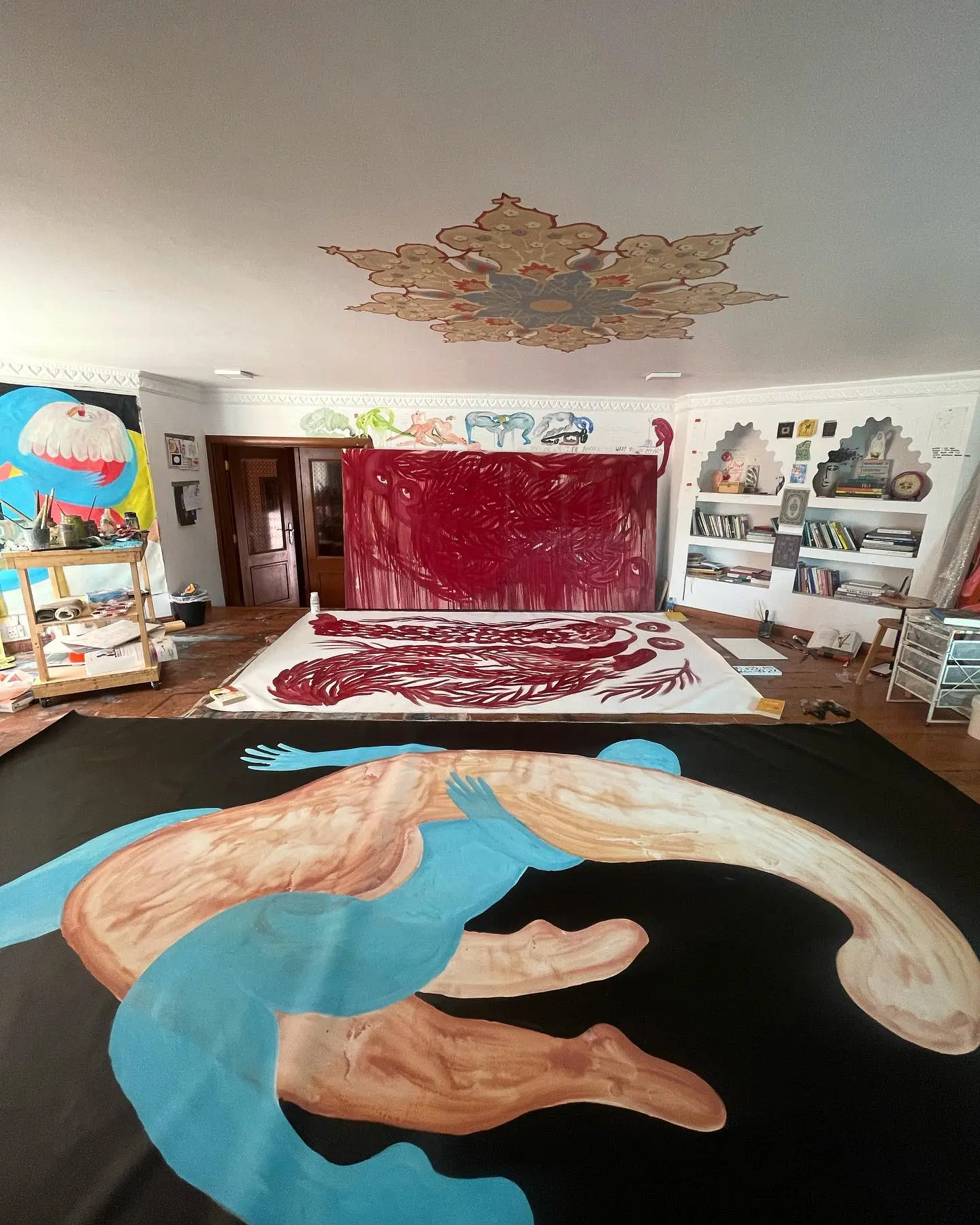 — This mandala was painted by my father’s friend, who is a muralist. My studio space is in my family’s home. The space used to hold all of the machines, heaters, and pipes of our home. My parents renovated it a bit and turned it into storage. Years later, it was turned into a Moroccan Diwaniya, and the mandala was painted then. When I returned from New York I painted in this space, and the patterns of the diwaniya are present in my paintings from 2019. During COVID, I painted the walls white and left the mandala only, the stained glass windows, and the patterns on the built-in bookshelf. The mandala is like an entryway into a state of seclusion. It centres me within the space and holds every event. It is the eye of the studio.
